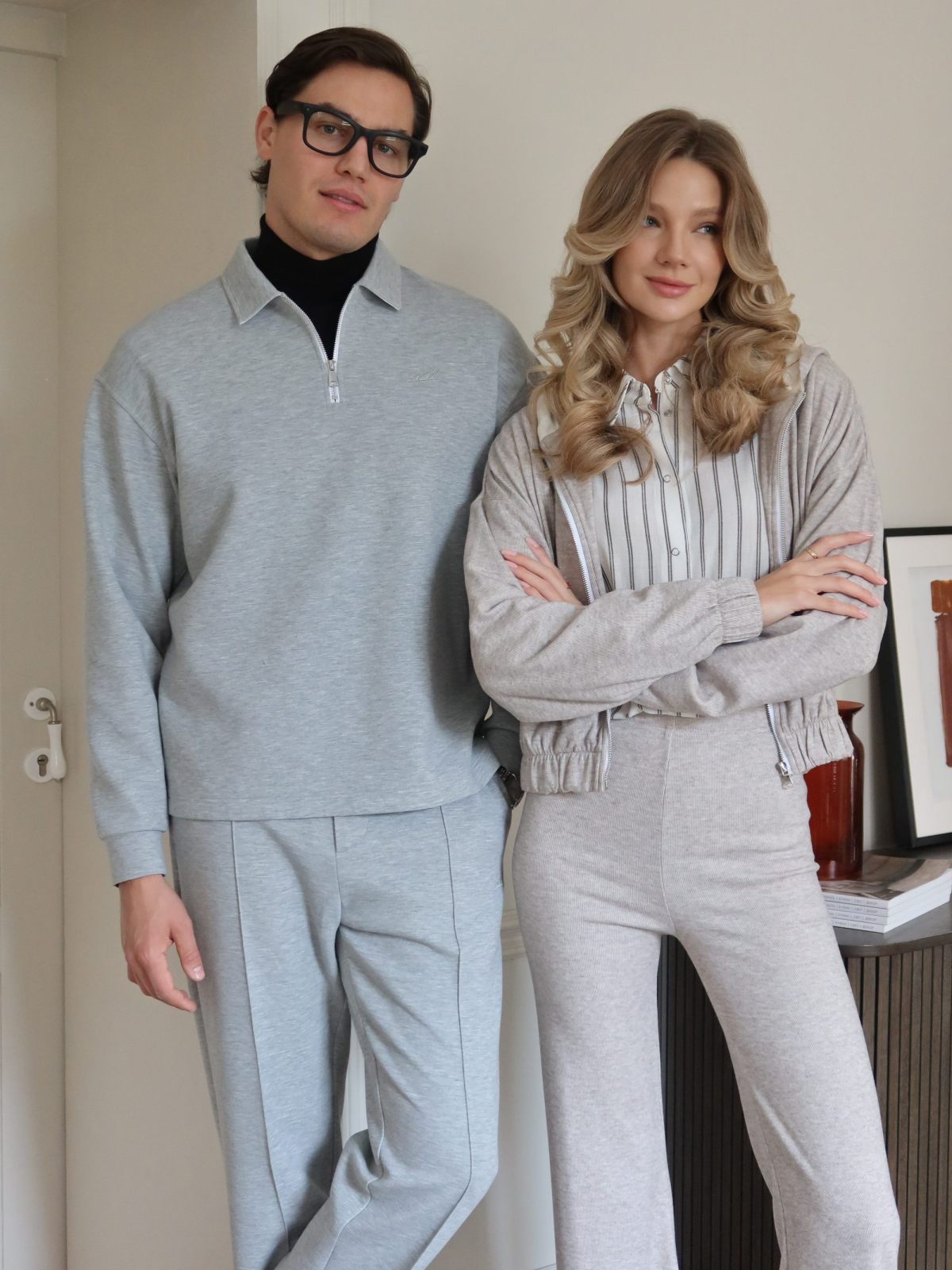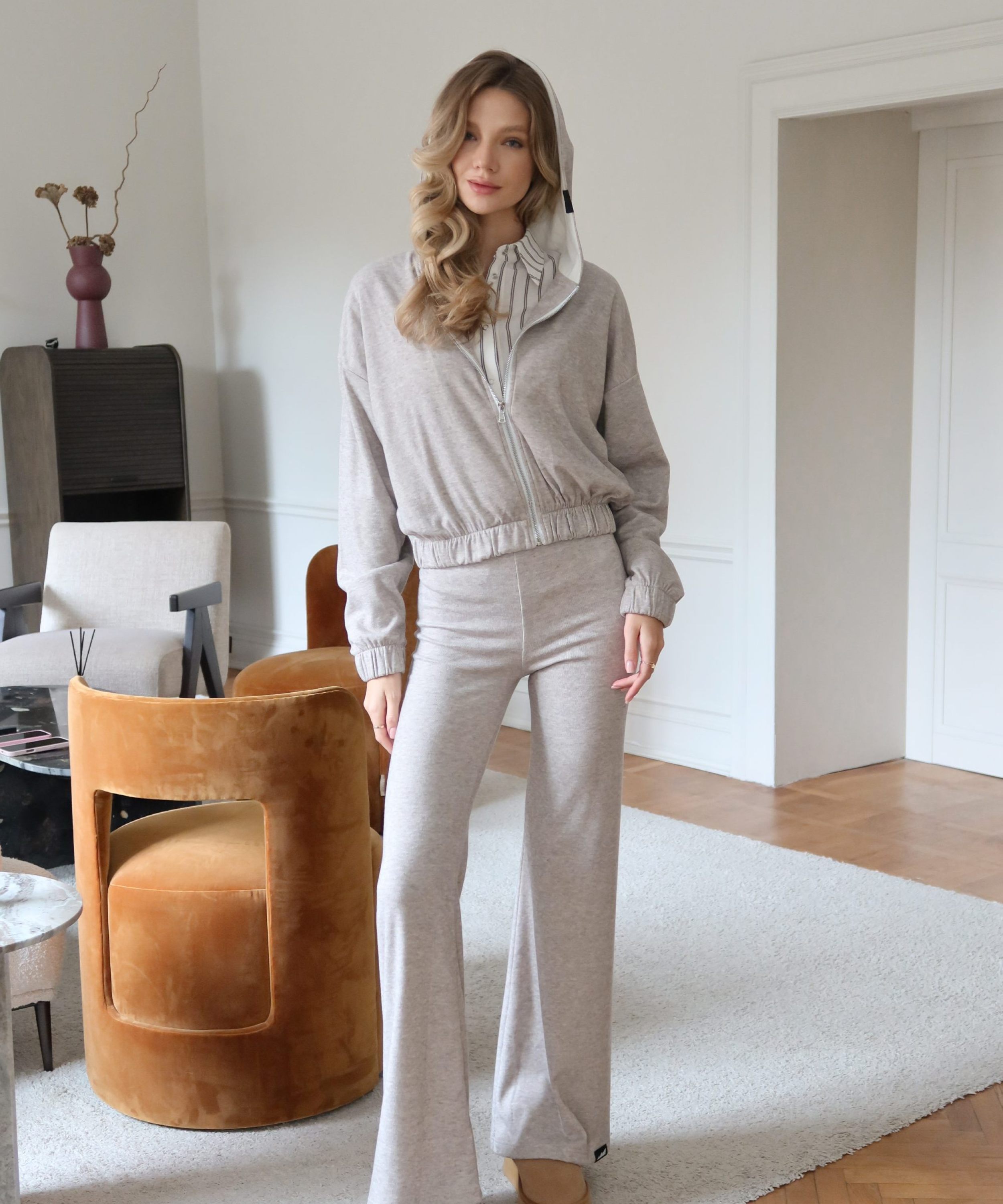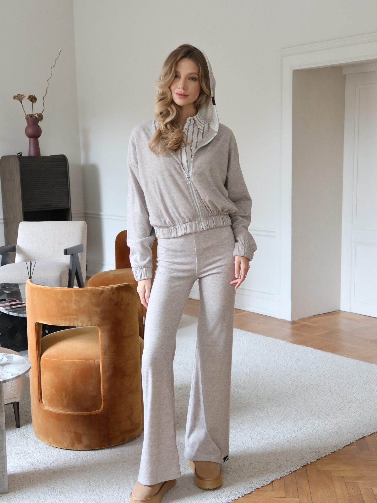 Расклешенные брюки с высокой посадкой выполнены из материала, в составе которого 67% полиэстера 25% вискозы и 8% эластана, за счет чего брюки невероятного мягкие и комфортные. На брюках внизу с левой стороны расположен лаконичный жаккардовый флажок с логотипом бренда. Брюки представлены в двух классических цветах: серый и бежевый меланж. Комплектом к брюкам в ассортименте имеется худи W5HOM34. Отличный выбор для комфортного образа в спортивном стиле на каждый день.