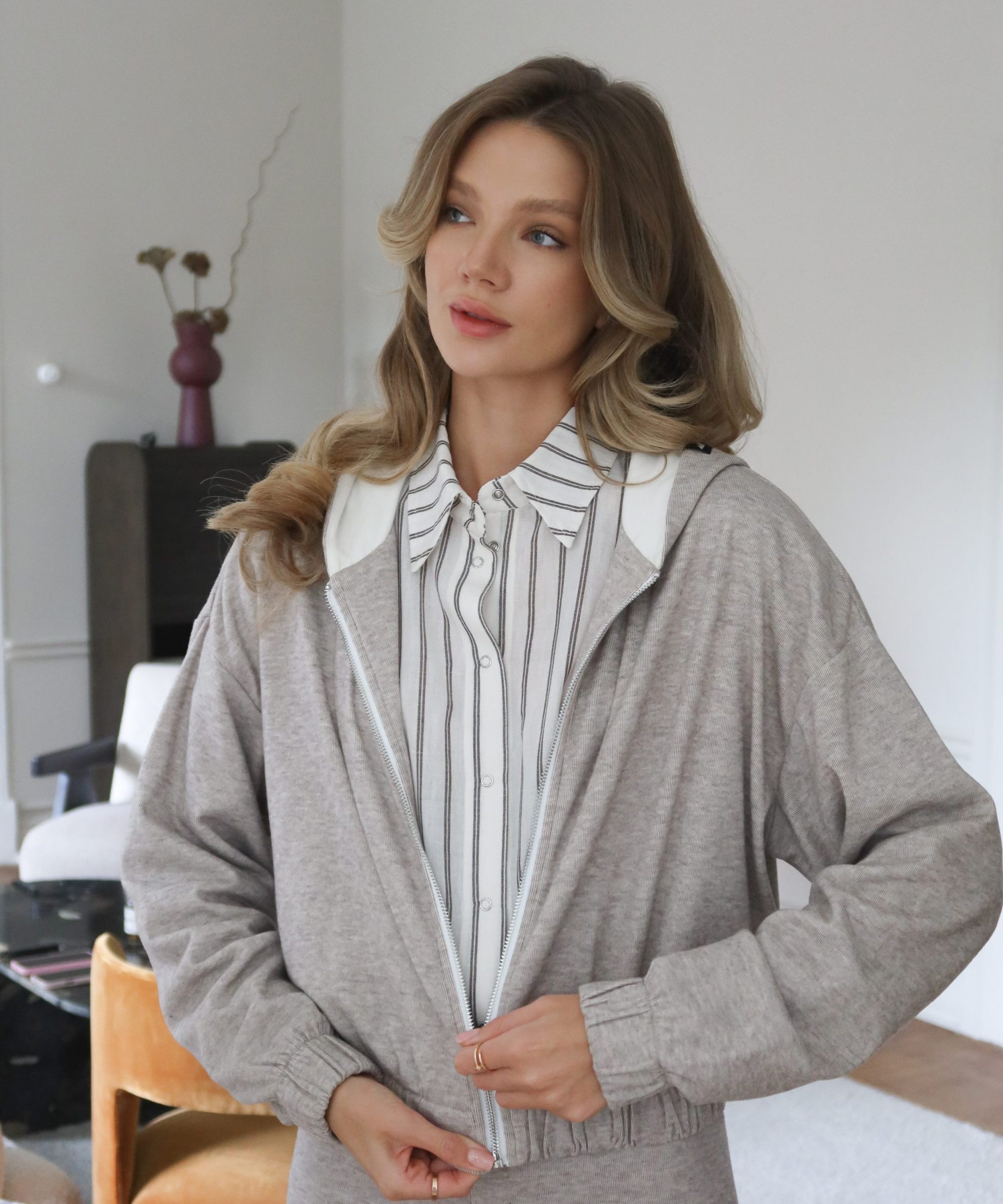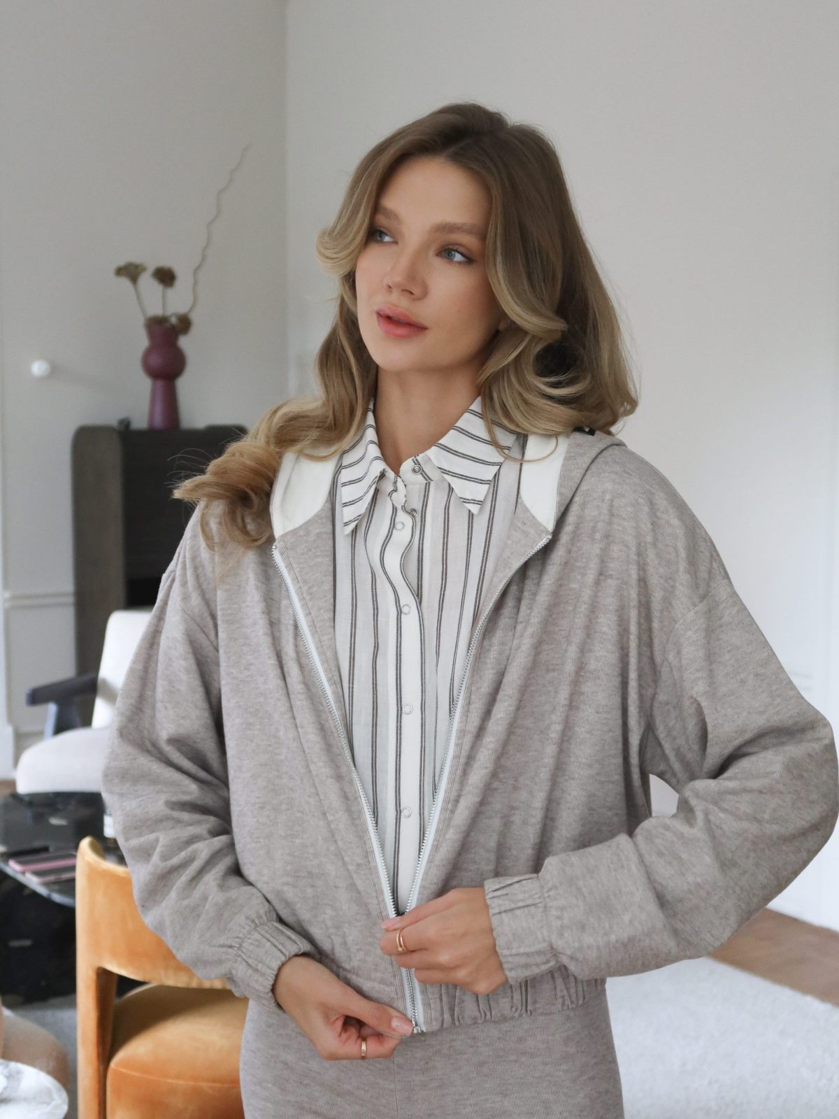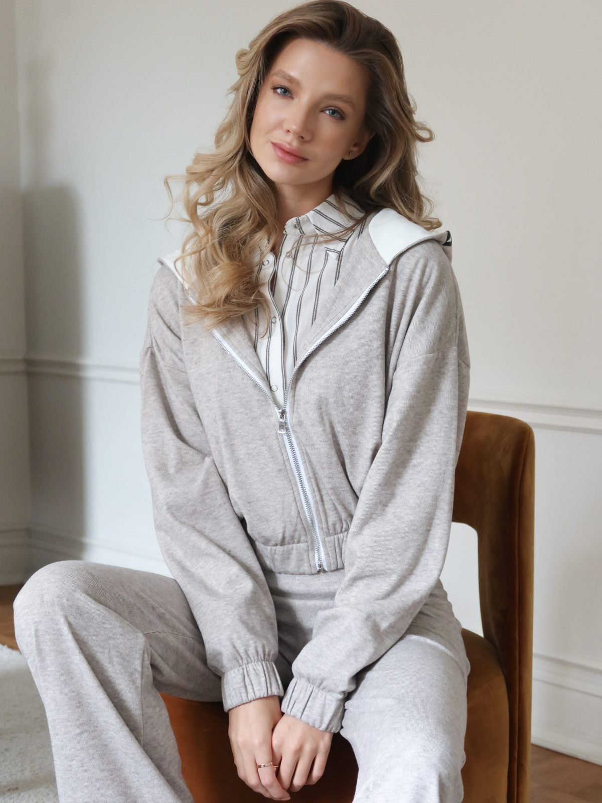 Укороченный худи на молнии свободного кроя выполнен из материала, в составе которого 67% полиэстера 25% вискозы и 8% эластана, подкладка капюшона сделана из материала с эффектом peach, за счет чего худи невероятного мягкий и комфортный. Внизу худи собран на резинку шириной 5 см, что обеспечивает отличную посадку. На капюшоне расположен лаконичный жаккардовый флажок с логотипом бренда. Худи представлен в двух классических цветах: серый и бежевый меланж. Комплектом к худи в ассортименте представлены брюки W5HOM84. Отличный выбор для комфортного образа в спортивном стиле на каждый день.