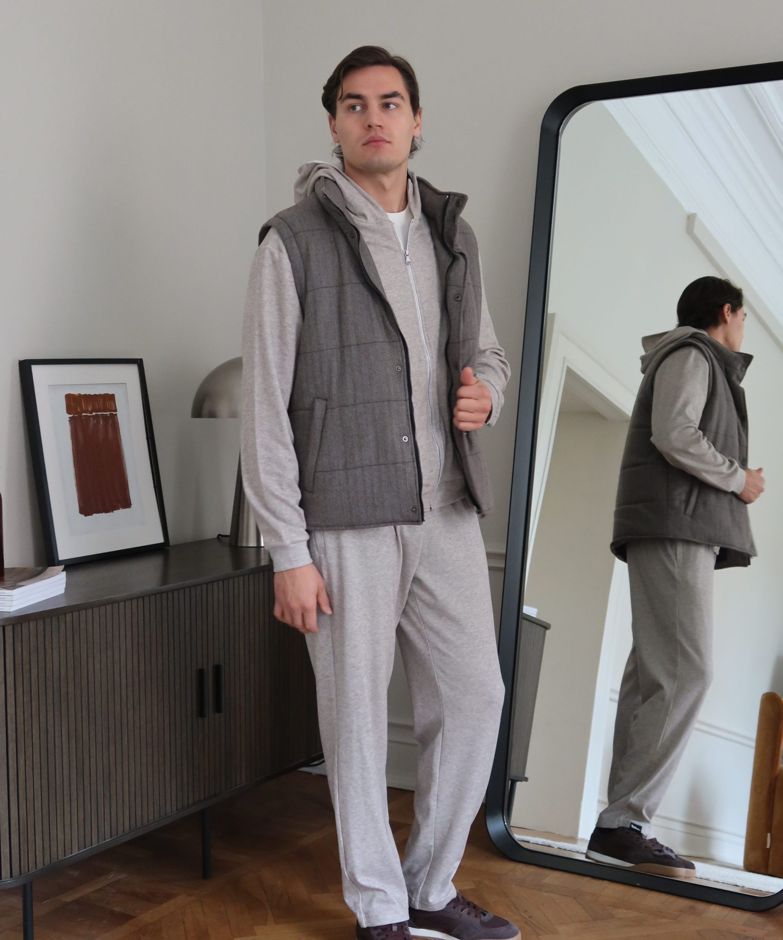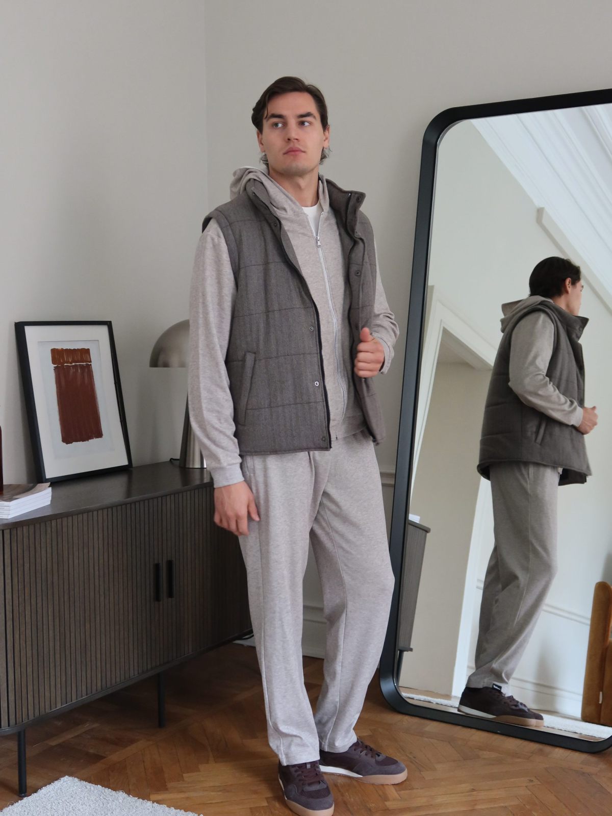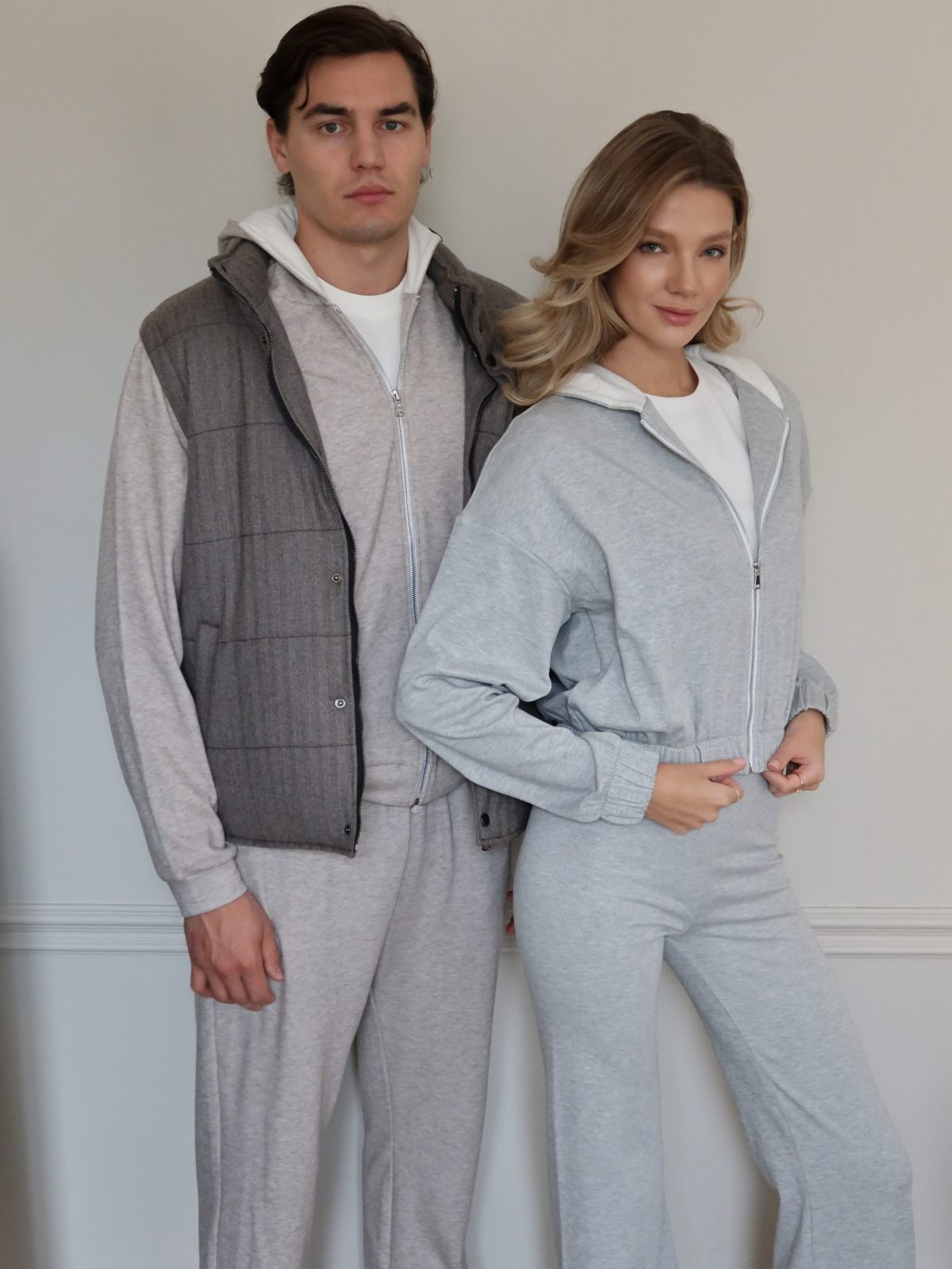 Прямые брюки выполнены из материала, в составе которого 67% полиэстера 25% вискозы и 8% эластана, за счет чего брюки невероятного мягкие и комфортные. На брюках внизу с левой стороны расположен лаконичный жаккардовый флажок с логотипом бренда. Брюки представлены в двух классических цветах: серый и бежевый меланж. Комплектом к брюкам в ассортименте имеется худи M5HOM34. Отличный выбор для комфортного образа в спортивном стиле на каждый день.