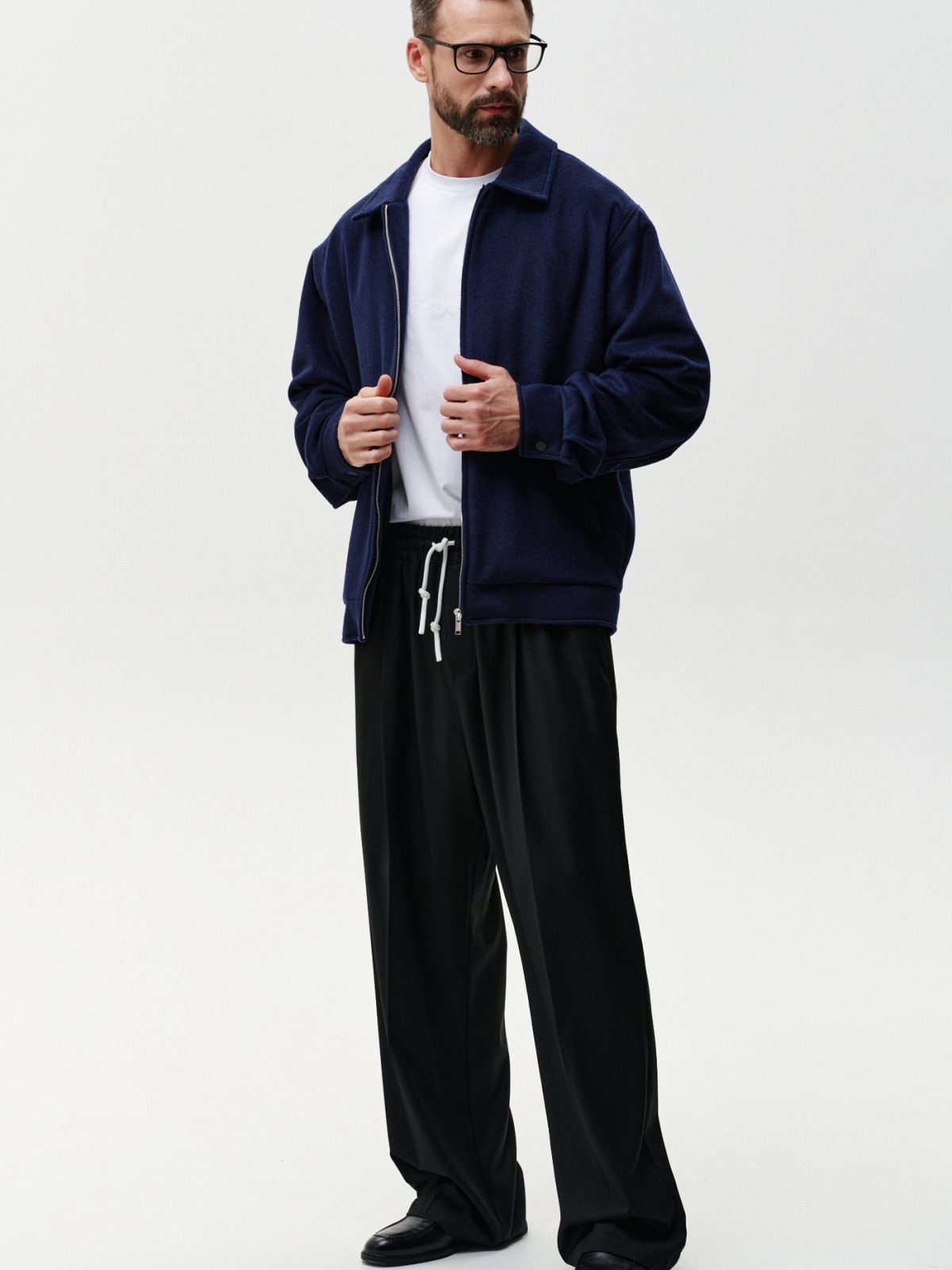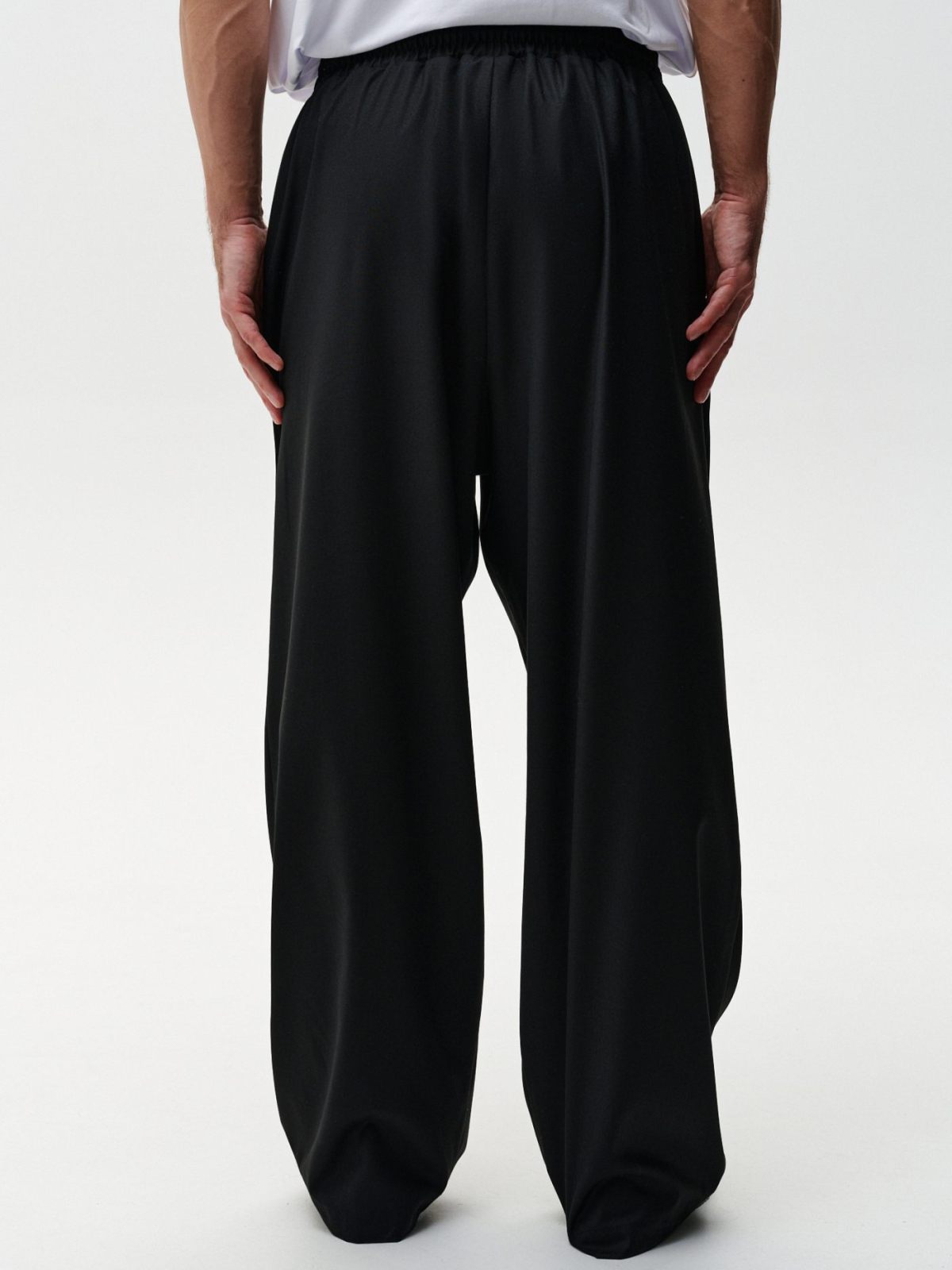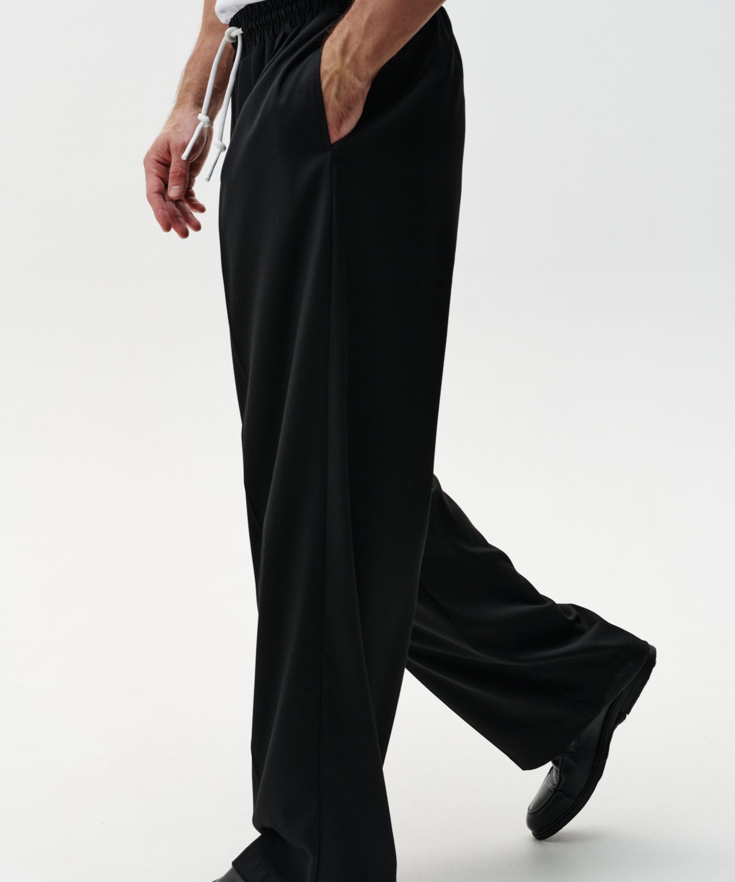 Широкие прямые брюки "Женя" свободного кроя из костюмной ткани с вискозой. На лицевой стороне выполнены защипы и декоративные стрелки. Брюки имеют два боковых кармана, эластичный пояс и контрастный шнурок для регулировки посадки. Гульфик на брюках декоративный. Свободный крой и структурный материал позволяют сочетать брюки с любыми верхами, в том числе свитерами, создавая стильные образы на каждый день.