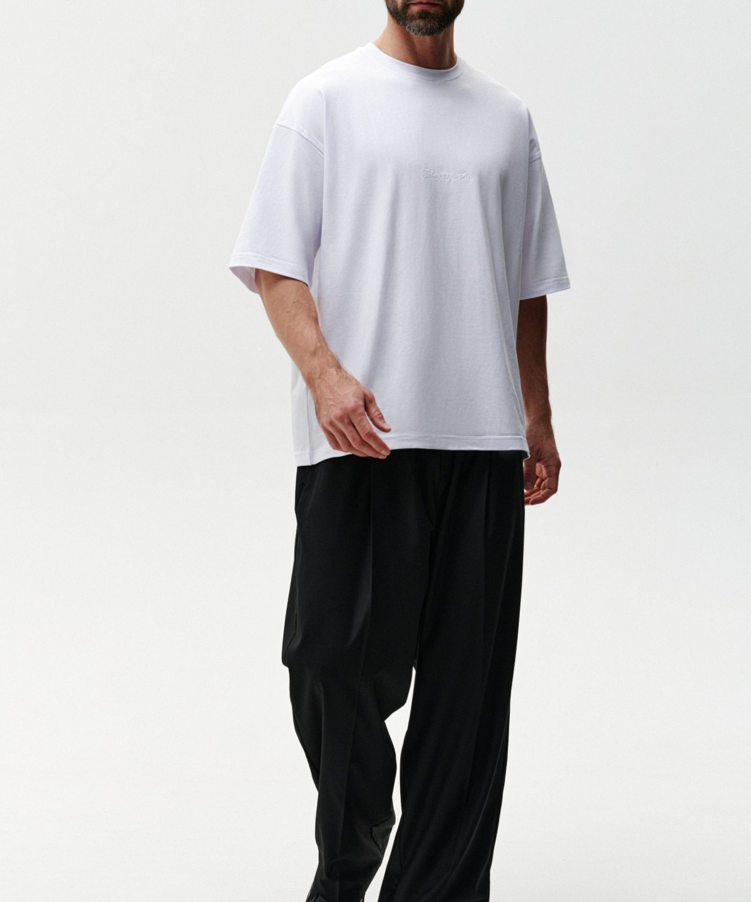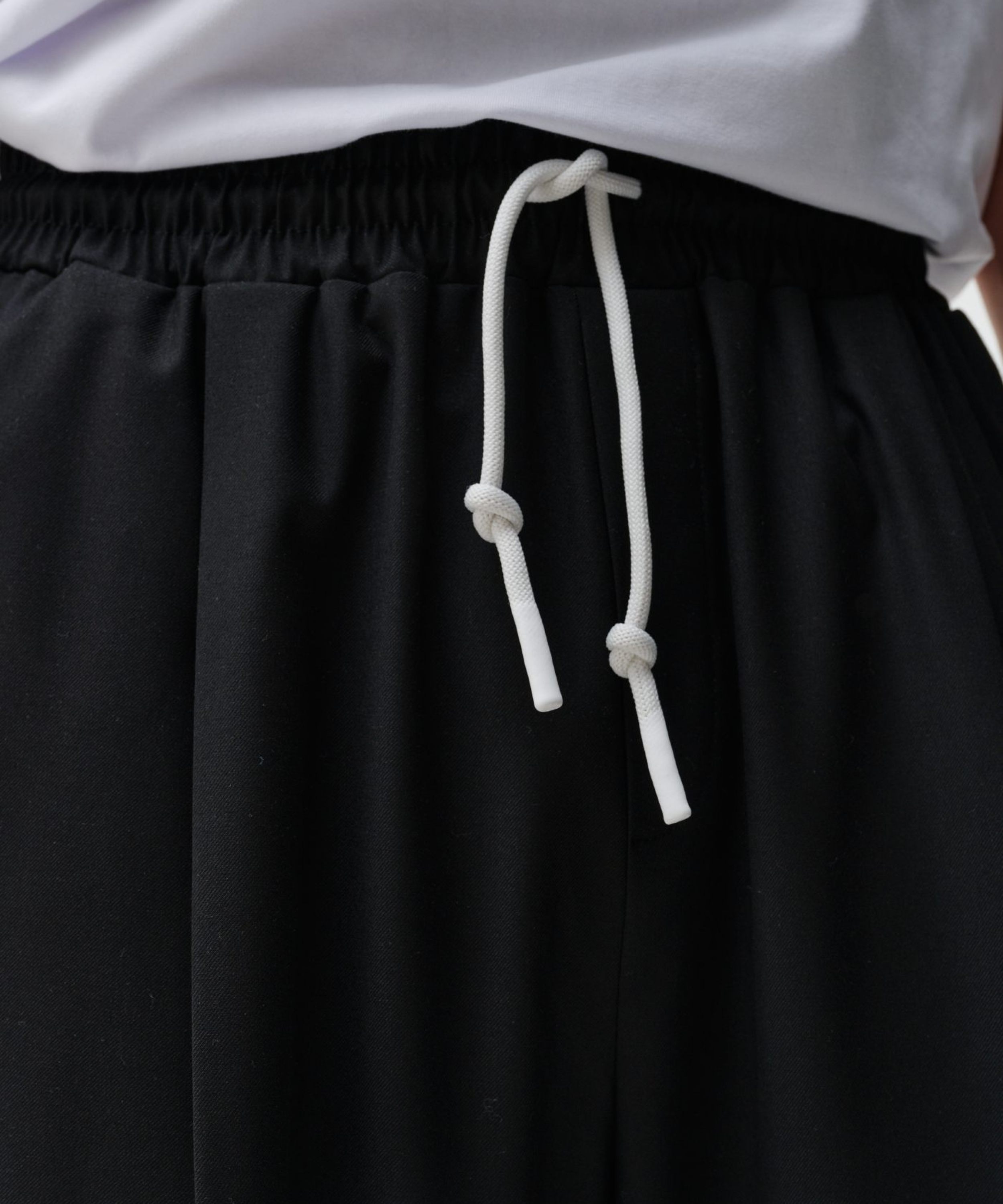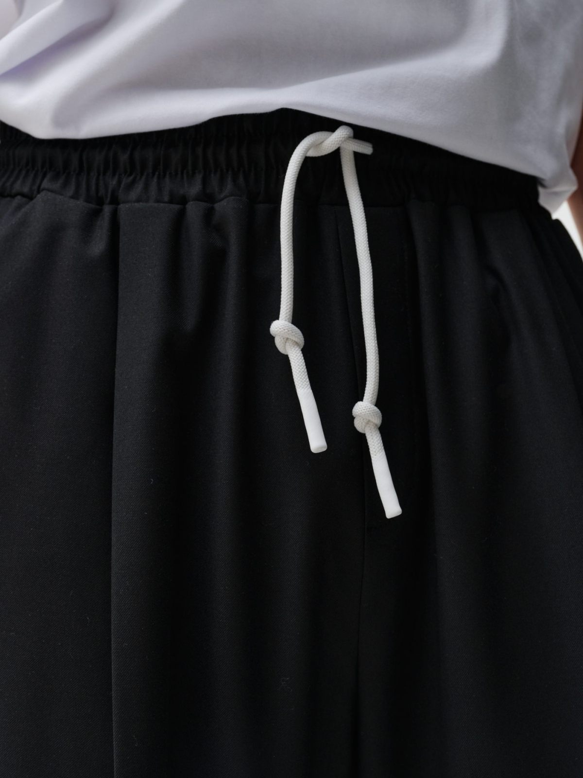 Широкие прямые брюки "Женя" свободного кроя из костюмной ткани с вискозой. На лицевой стороне выполнены защипы и декоративные стрелки. Брюки имеют два боковых кармана, эластичный пояс и контрастный шнурок для регулировки посадки. Гульфик на брюках декоративный. Свободный крой и структурный материал позволяют сочетать брюки с любыми верхами, в том числе свитерами, создавая стильные образы на каждый день.